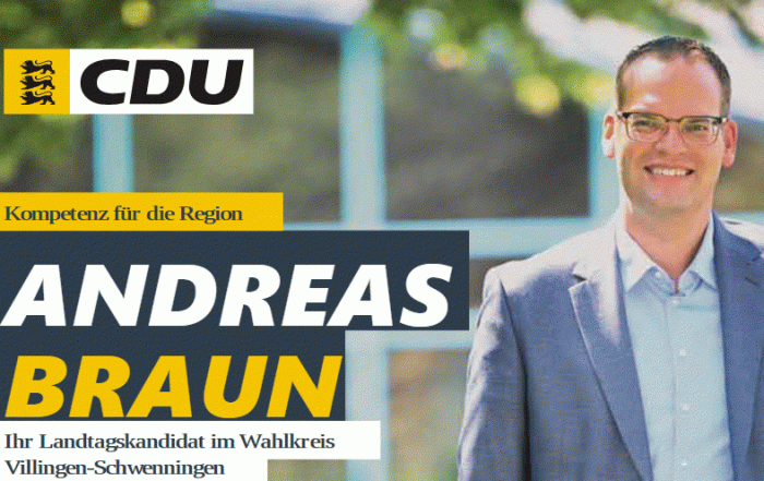 AndreasBraun_Fotos zum Rollen hier anklicken Der Wahlkreis 54 Schwarzwald-Baar Villingen braucht wieder einen Direktkandidaten für den Landtag in Stuttgart. Mit Andreas Braun Bürgermeister der Gemeinde Unterkirnach haben wir den richtigen Mann nominiert. Unterstützen Sie